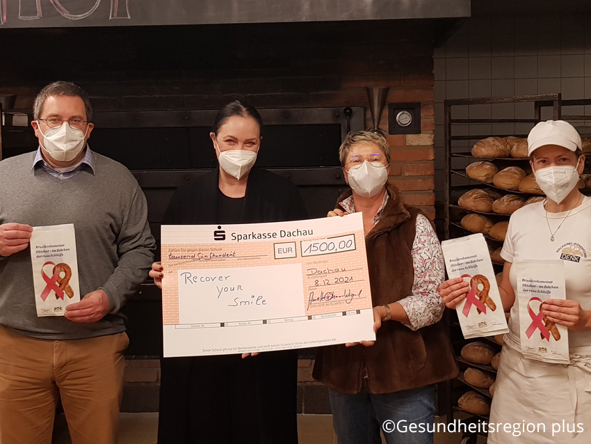 Die Spendensumme erhöhte die Genossenschaft zur Stärkung der gesundheitlichen Versorgung im Landkreis Dachau, welche diese Initiative gemeinsam mit dem Genossenschaftsmitglied und Gynäkologen Dr. Florian Ebner initiiert hat, auf 3.000 Euro. Die Hälfte davon wurde nun an „NANA – Recover your Smile“ übergeben. Dabei handelt es sich um einen landkreisübergreifender Verein, der für an Krebs erkrankte Menschen kostenlose Workshops mit professionellen Make-Up Artist veranstaltet, an dessen Ende ein professionelles Fotoshooting steht. Die andere Hälfte der 3.000 Euro ging an die „Pink Kids“ – ein Zusammenschluss junger Menschen, die alle schon Erfahrung mit dem Thema Brustkrebs in der Familie gemacht haben und die Interessierten die Möglichkeit bieten, Informationen und Hilfestellungen zum Thema zu bekommen. Das Helios Amper Klinikum Dachau hat sich anlässlich der Laugenschleifenaktion zudem bereit erklärt, bis zu weiteren 5.000 Euro an eine Organisation dessen Wahl zu spenden.